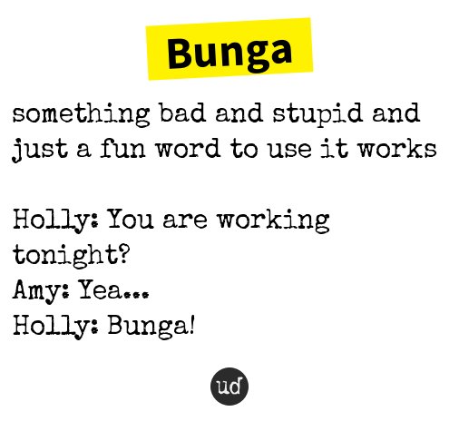 I guess you could call me a bunga. Mention @urbandictionary and this bot will tweet you the urban dictionary definition (if it's in there). We found 2 dictionaries with english definitions that include the word bunga bunga: Dude you're so annoying. person2: 4,444,883 likes · 3,920 talking about this.